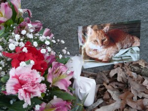A circle of life that started almost 18 years ago was completed on Friday when we picked up the remains of my red tabby Judas and laid her to rest. I had already bought a keepsake (4”) cloisonné vase similar to the one holding some of the ashes from her brother Hercules (4/5/11). The one for Judas is white with flowers, while Hercules’ vase has a blue design. They will drape a box holding their collars and which also has a photo of the two of them when they were fur babies.